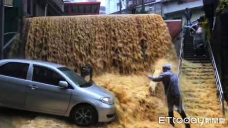 ▲基隆豪雨市区惊现「黄泥瀑布」