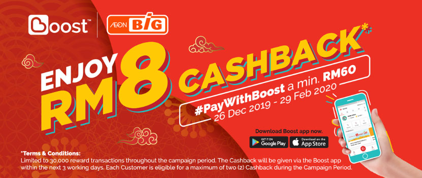 只要我们在2019年12月26日至2020年2月29日在 AEON Big 消费 RM60 或以上,我们就可获得 RM8 Cashback 现金回扣。