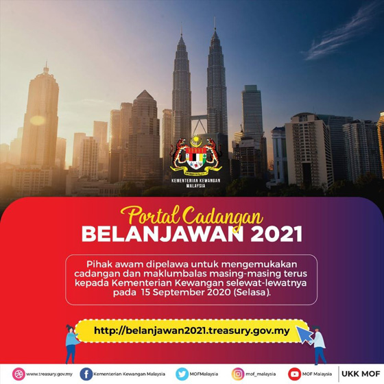 马来西亚财政部目前正在草拟2021年财政预算案,并诚挚地邀请民众浏览财政部官方网站提供意见反馈,以协助草拟2021年财案。有关网站从2020年8月15日起开放至9月15日。